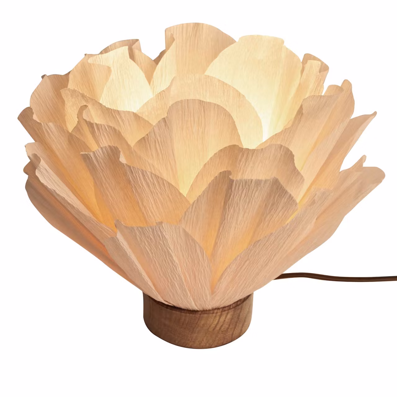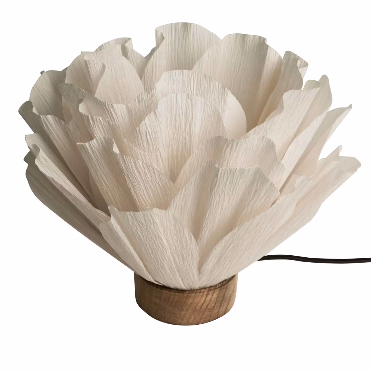 Lisa bordslampa från Watt & Veke är inspirerad av lotusblommans skönhet. Dess formbara blad i crepepapper erbjuder mjukt ljus och harmoni. Basen av mangoträ tillför en naturlig känsla, medan sladdens kontrasterande färg ger en snygg kontrast. Bordslampan blir ett konstverk som ger ditt hem en unik touch oavsett om den står placerad på nattduksbordet, fönstret eller på ett sidobord.