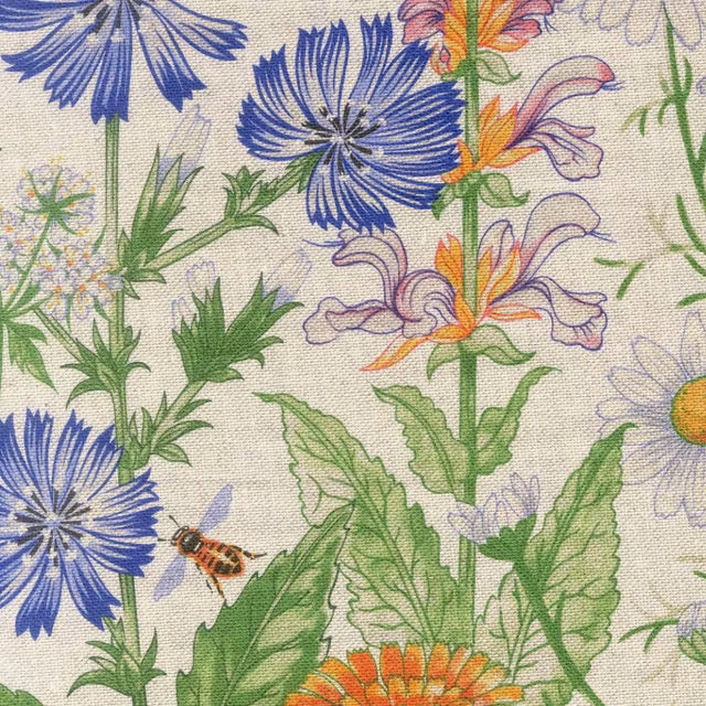 Vacker textilvaxduk i linnelook med blommor som på en vacker sommaräng i alla tänkbara färger. Här hittar du fåglar, insekter och fjärilar som njuter av blommorna tillsammans med oss. Perfekt för att sprida glädje och färg vid alla tillfällen.