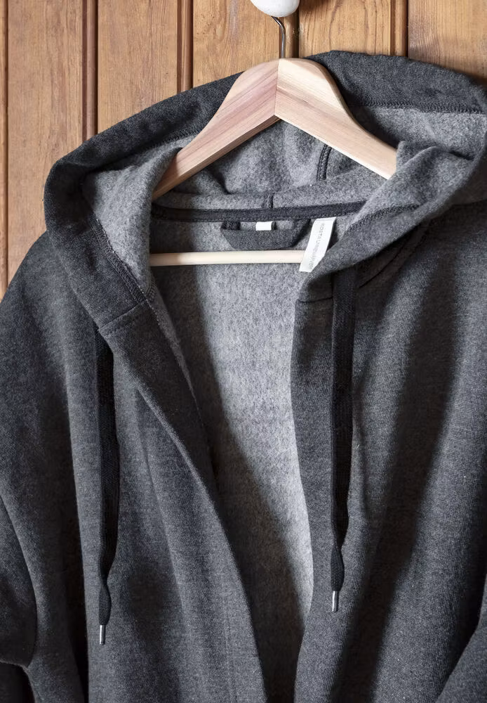 En helt unik variant av bad/morgonrock! Detta är en underbar hybridrock i collegetyg. Den passar lika bra att bära efter träning, bad eller bara till att mysa i. Den har två fickor och mudd i ärmarna. Huvband och skärp i midjan.